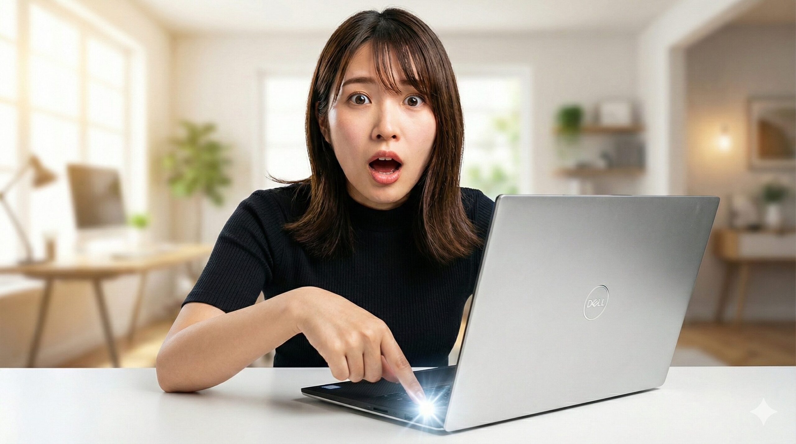 Dellノートパソコンの本体手前にある白いステータスランプが点灯し、それを指差す日本人女性